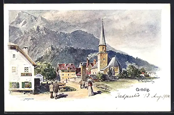Künstler-AK Franz Kulstrunk: Grödig, Ortspartie an der Kirche