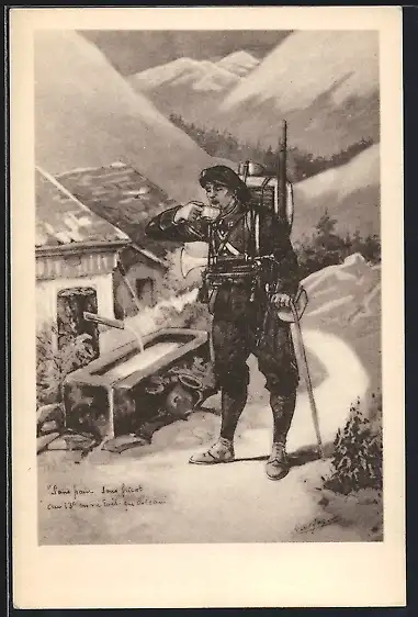 Künstler-AK Französischer Infanterist in Uniform bei einer Trinkpause