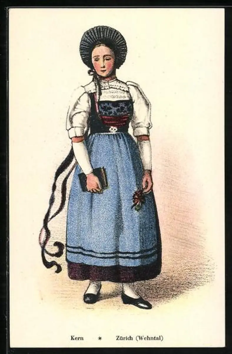Künstler-AK Frau in Trachtenkleid mit Buch aus dem Wehntal bei Zürich