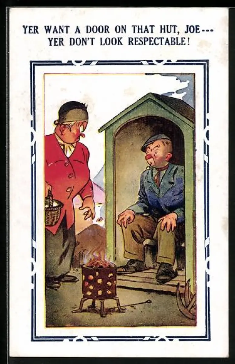 Künstler-AK Frau schaut einen Mann griesgrämig an, Yer want a door on that hut, Joe...