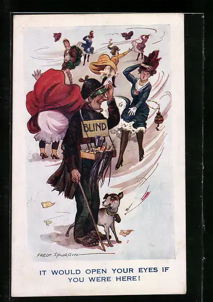 Künstler-AK Fred Spurgin: Blinder Bettler und hochwehende Damenröcke