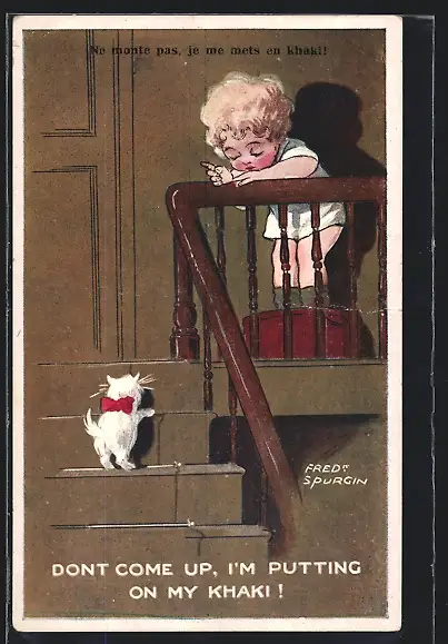 Künstler-AK Fred Spurgin: Khaki, Don`t come up..., Kind und Kätzchen