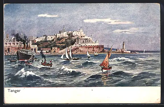 Künstler-AK Friedrich Perlberg: Tanger, Ausflugsdampfer und Segelschiffe vor der Stadt