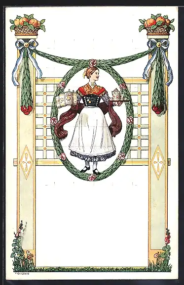 Künstler-AK Fritz Quidenus: Frau in Tracht mit Bierkrügen und Kaffeeservice
