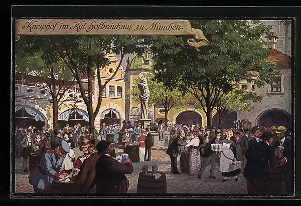 Künstler-AK Fritz Quidenus: Münchner Hofbräuhaus, Kneiphof mit flanierenden Gästen
