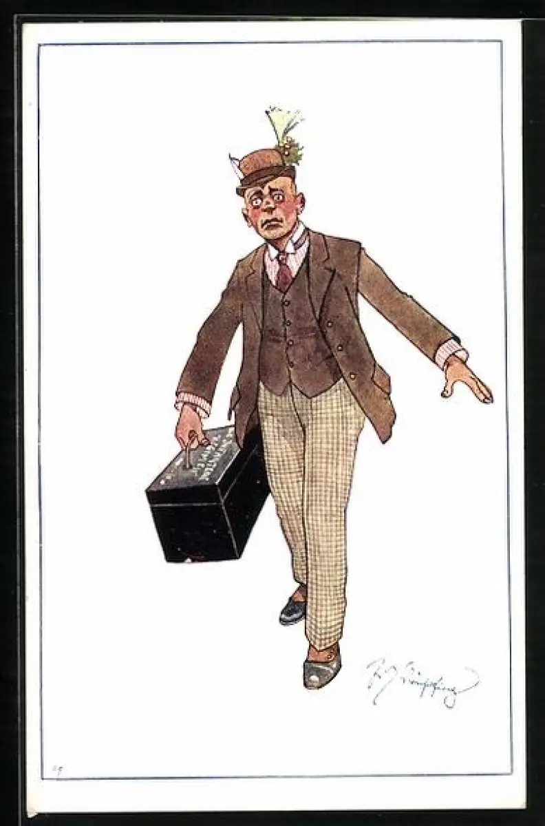 Künstler-AK Fritz Schönpflug: Herr im Anzug mit einem Koffer des K. u. k. Infanterie-Regiment