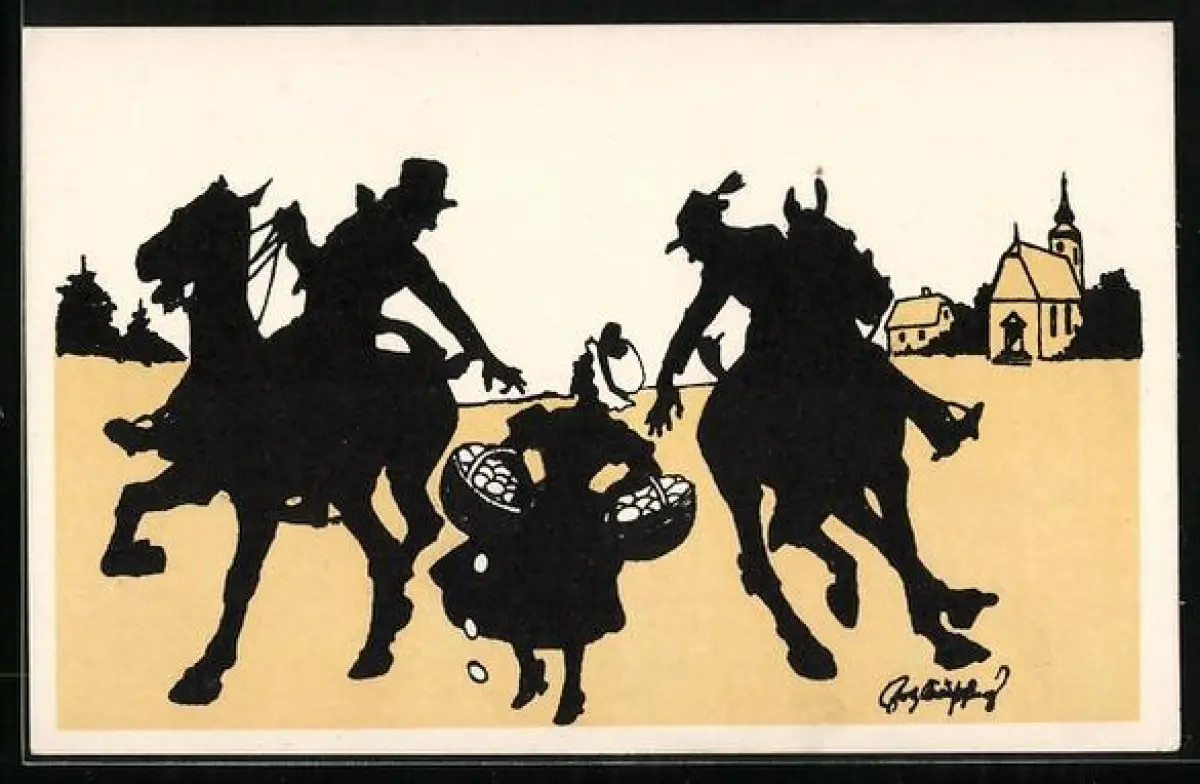 Künstler-AK Fritz Schönpflug: Männer zu Pferd bedrängen eine Frau mit zwei Körben voller Eier