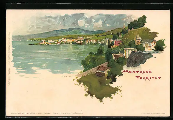 Künstler-AK Fritz Voellmy: Montreux-Territet, Totalansicht mit Blick auf den See