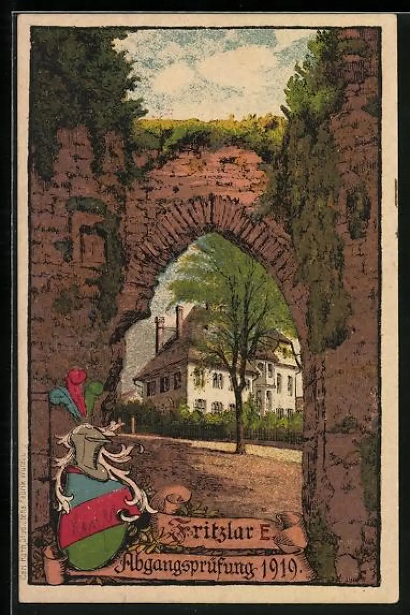 Künstler-AK Fritzlar /E., Abgangsprüfung 1919, Studentenwappen vor einer Burgmauer