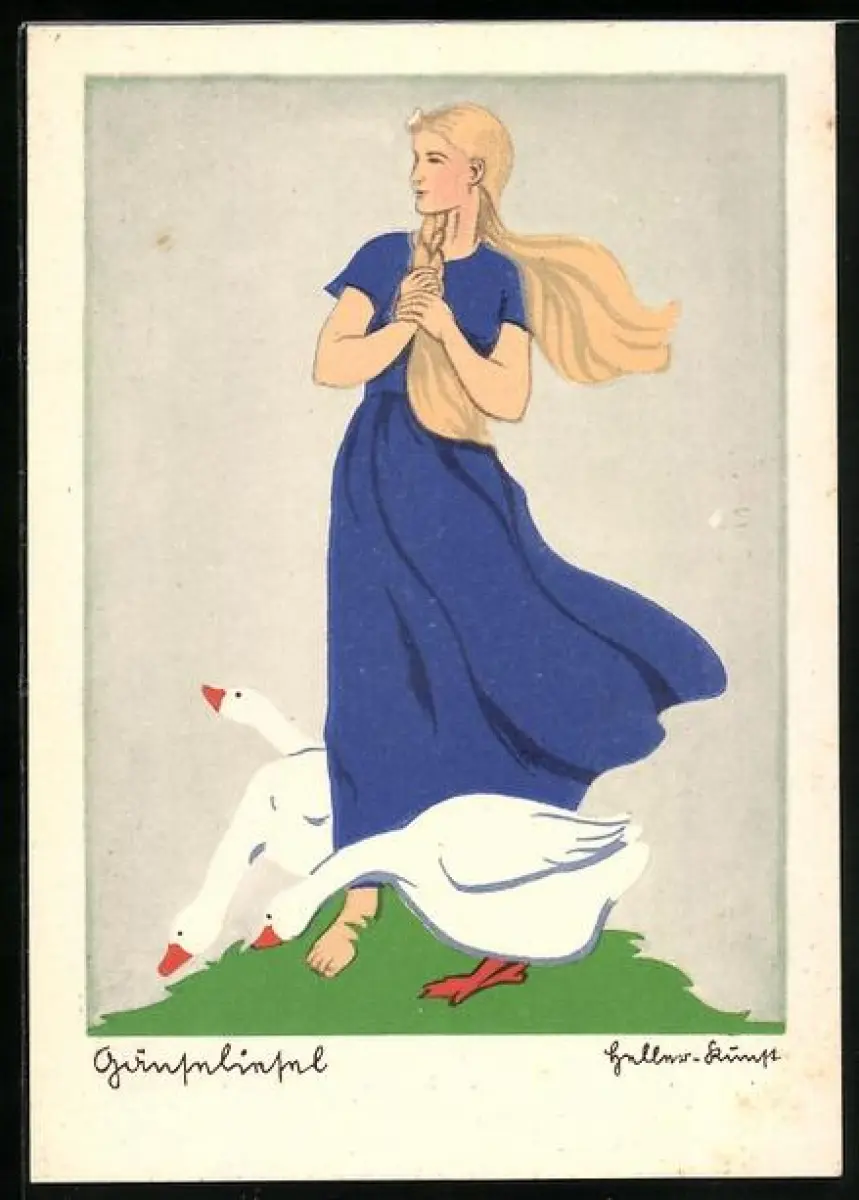 Künstler-AK Gänseliesel mit Gänsen auf einer Wiese, Märchen