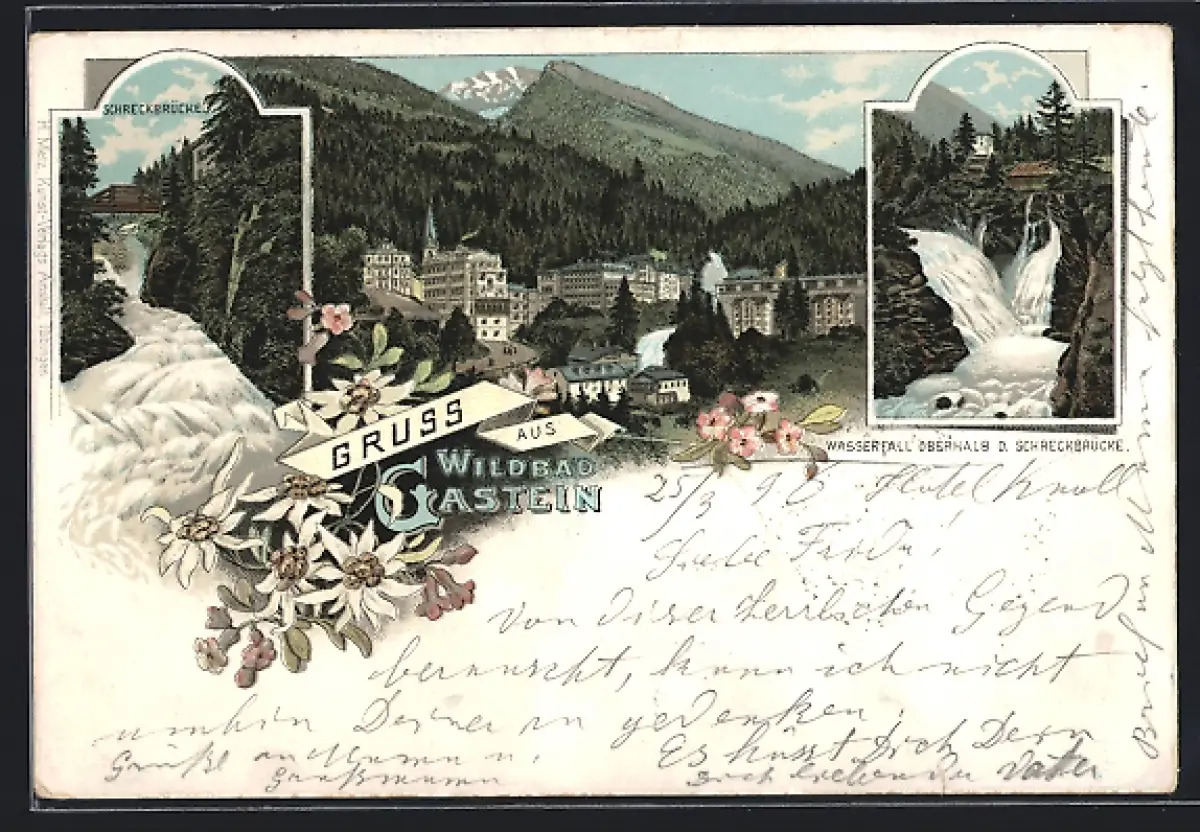 Künstler-AK Gastein, Panorama, Schreckbrücke, Wasserfall oberhalb der Schreckbrücke