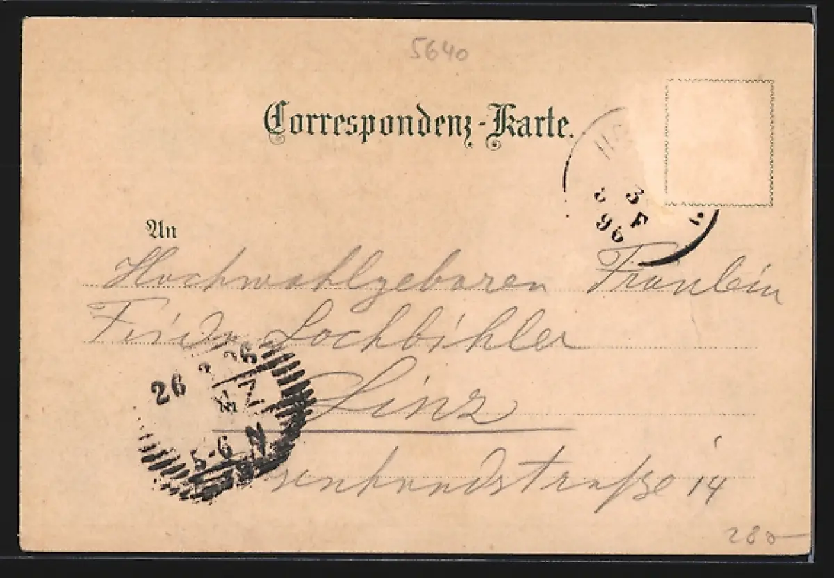 alte Ansichtskarte, gelaufen 1896, Briefmarke entfernt, rückseitig Oberflächenschaden, Bugspur li. mittig, guter Zustand