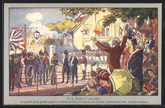 Künstler-AK Genève, 1er juin 1814, Le syndic de la garde recoit à la Porte de Rive...