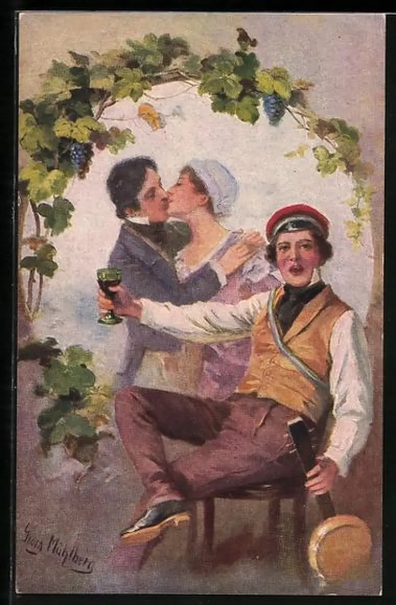 Künstler-AK Georg Mühlberg: Burschenschafter mit Gitarre und Weinglas in der Hand, Mann küsst seine Geliebte