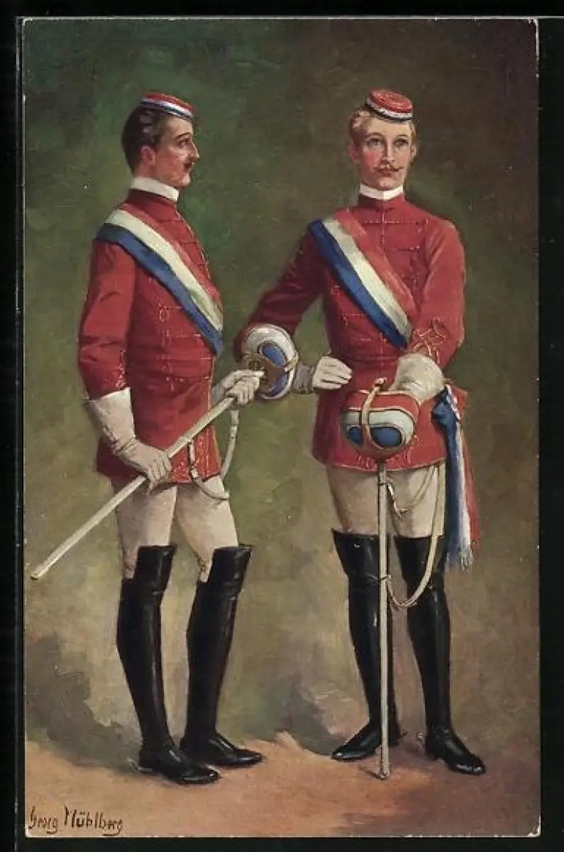 Künstler-AK Georg Mühlberg: Die Herren Chargierten, Zwei Studenten mit Degen