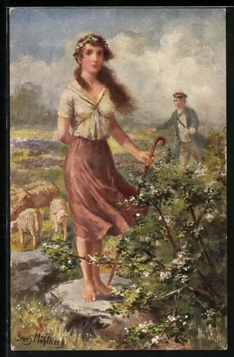 Künstler-AK Georg Mühlberg: Sah ein Knab` ein Röslein steh`n..., Mann sieht junge Frau auf der Wiese