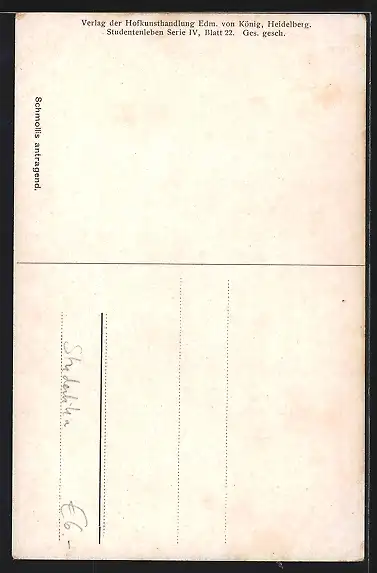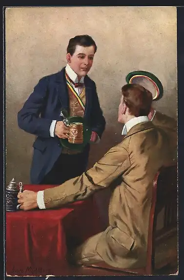 Künstler-AK Georg Mühlberg: Schmollis antragend, zwei Studenten trinken Bier