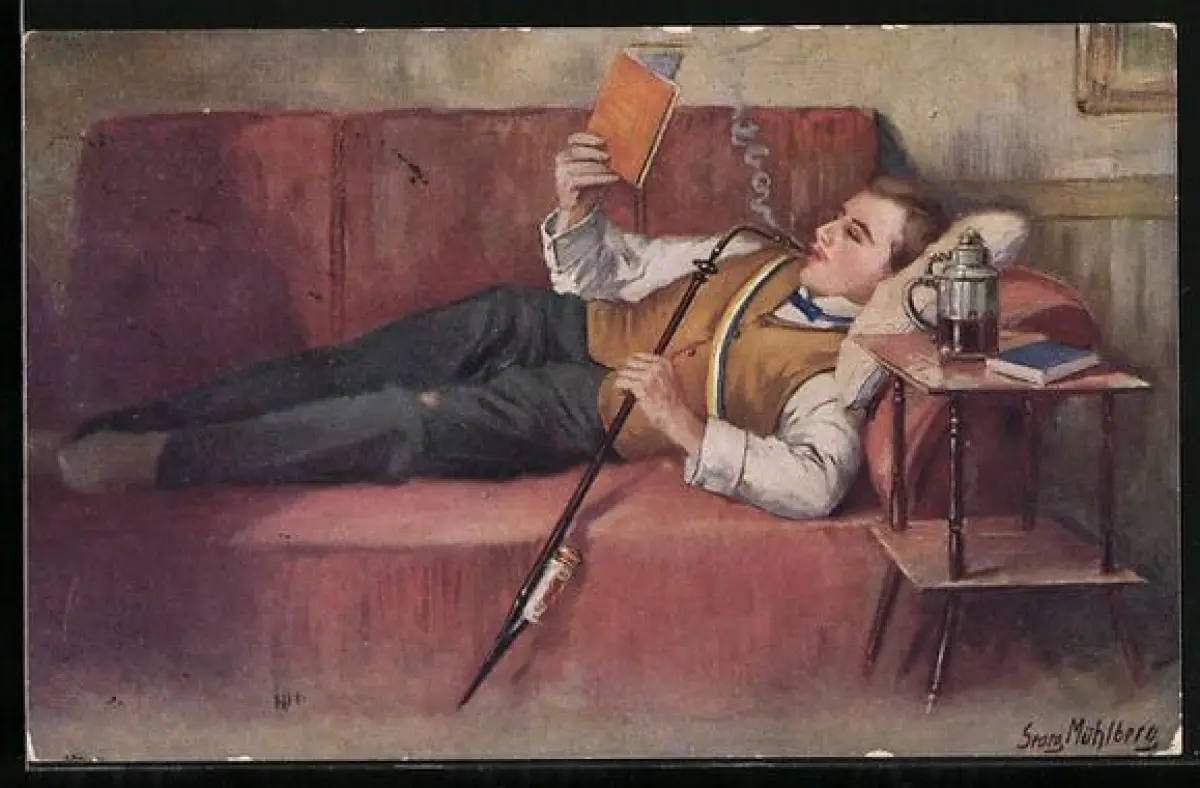 Künstler-AK Georg Mühlberg: Studio auf der Bude, Student liegt Pfeiferauchend auf dem Sofa und liest ein Buch