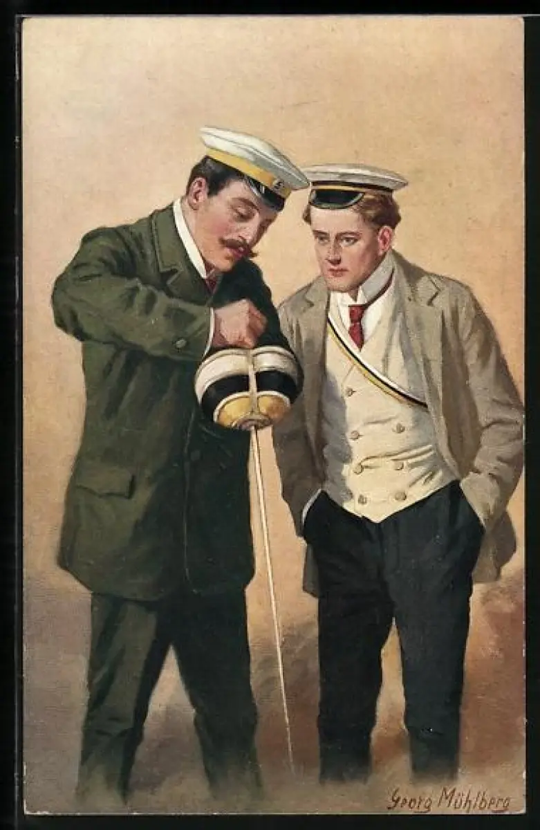 Künstler-AK Georg Mühlberg: Zwei Studenten mit einem Degen