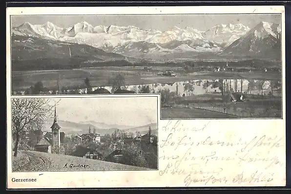 Künstler-AK Gerzensee, Ortsansicht mit Kirche und Gebirgspanorama