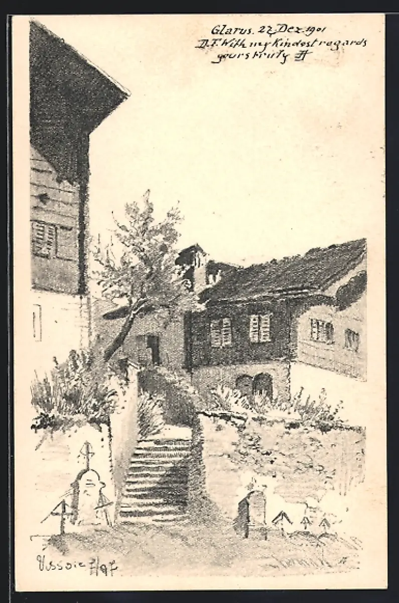 Künstler-AK Glarus, Teilansicht mit Wohnhäusern