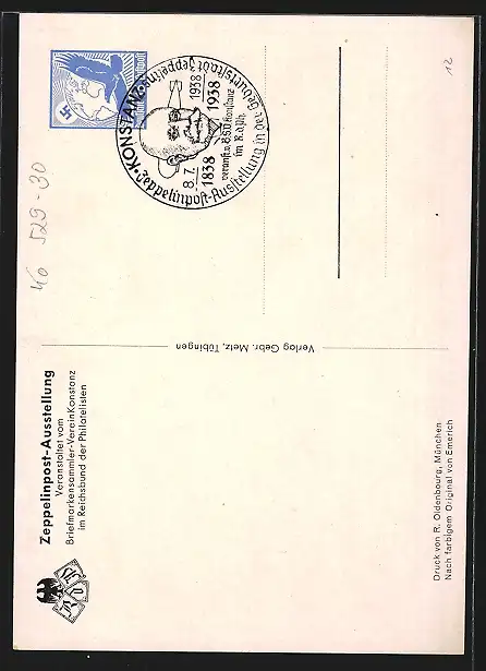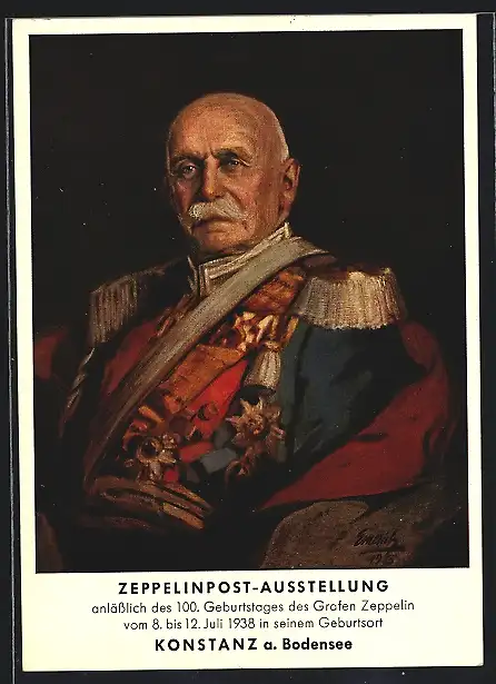 Künstler-AK Graf Zeppelin in Uniform, Ausstellung 100. Geburtstages des Grafen Zeppelin 1938, Ganzsache