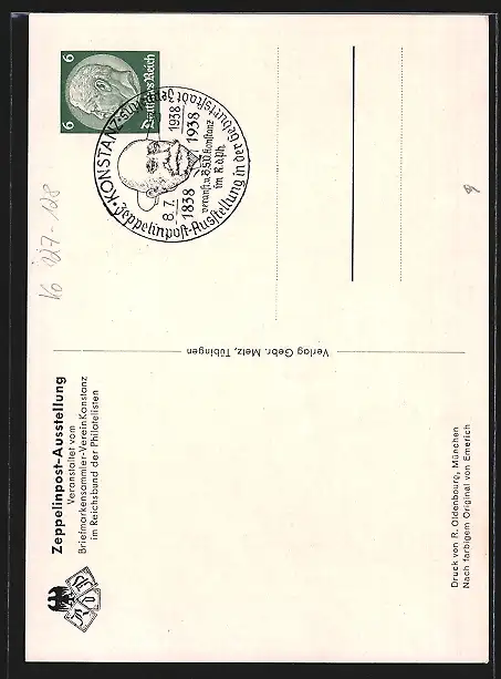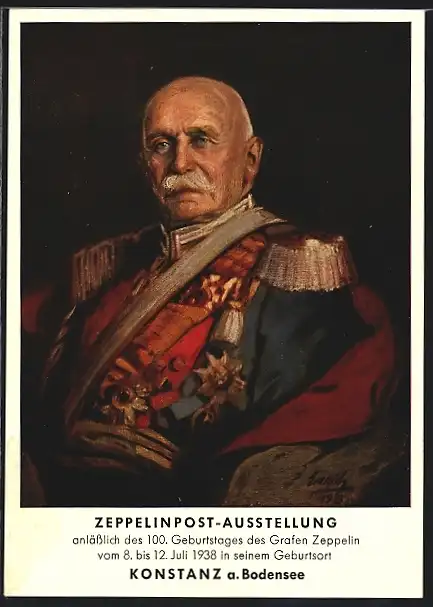 Künstler-AK Graf Zeppelin in Uniform, Ausstellung 100. Geburtstages des Grafen Zeppelin 1938, Ganzsache