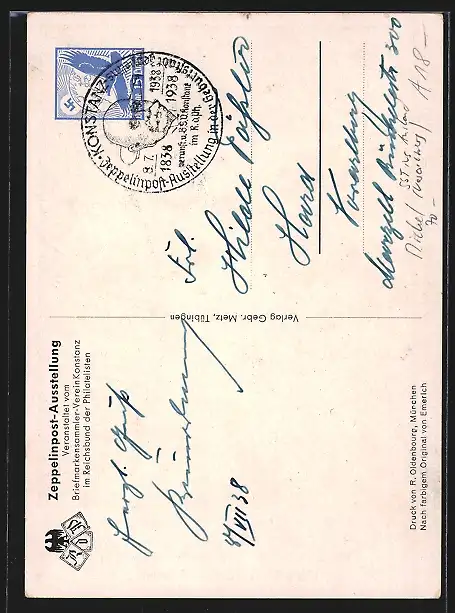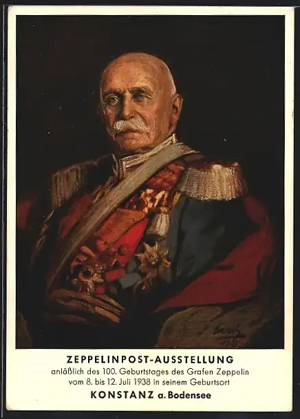 Künstler-AK Graf Zeppelin in Uniform, Ausstellung 100. Geburtstages des Grafen Zeppelin 1938, Ganzsache