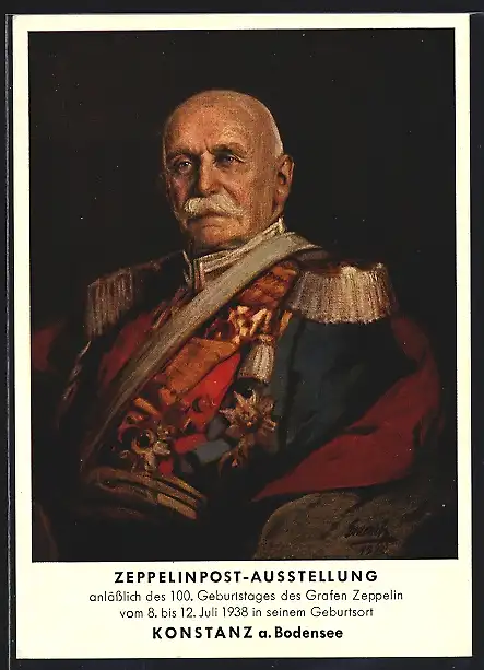 Künstler-AK Graf Zeppelin in Uniform, Ausstellung 100. Geburtstages des Grafen Zeppelin 1938, Ganzsache