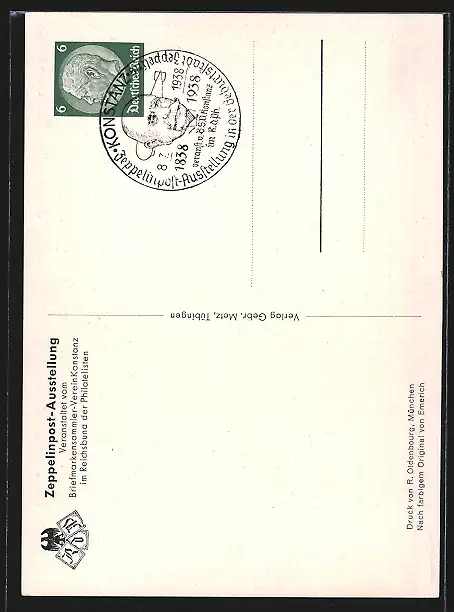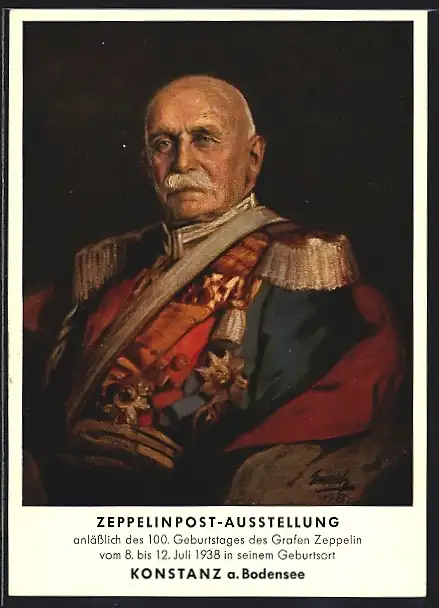 Künstler-AK Graf Zeppelin in Uniform, Ausstellung 100. Geburtstages des Grafen Zeppelin 1938, Ganzsache