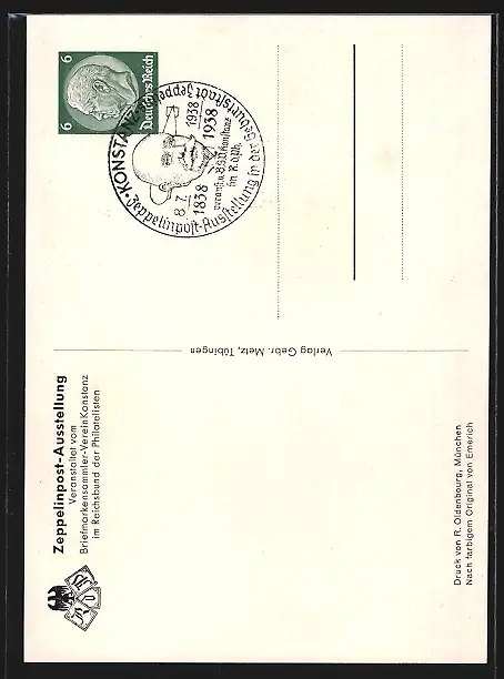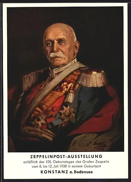 Künstler-AK Graf Zeppelin in Uniform, Ausstellung 100. Geburtstages des Grafen Zeppelin 1938, Ganzsache