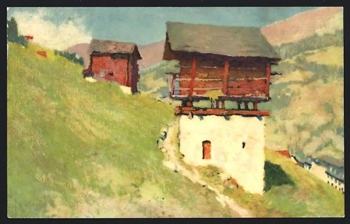 Künstler-AK Grimentz, Steingebäude mit Heuspeicher-Überbau, Ortspartie