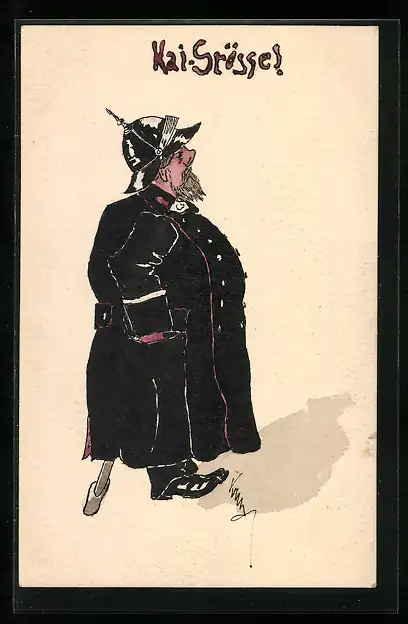 Künstler-AK Handgemalt: Kai-Grösse, Beleibter Soldat in schwarzer Uniform mit Pickelhaube