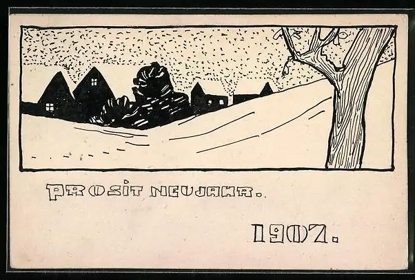 Künstler-AK Handgemalt: Ort im Schneetreiben, Prosit Neujahr 1907