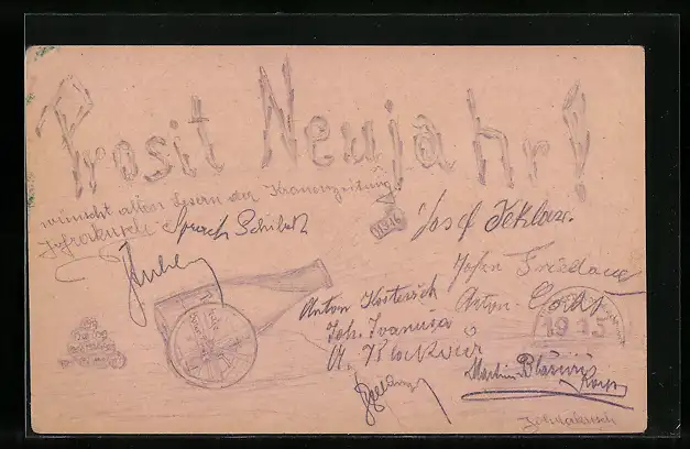 Künstler-AK Handgemalt: Prosit Neujahr, Sekt-Kanone verschiesst das Jahr 1916
