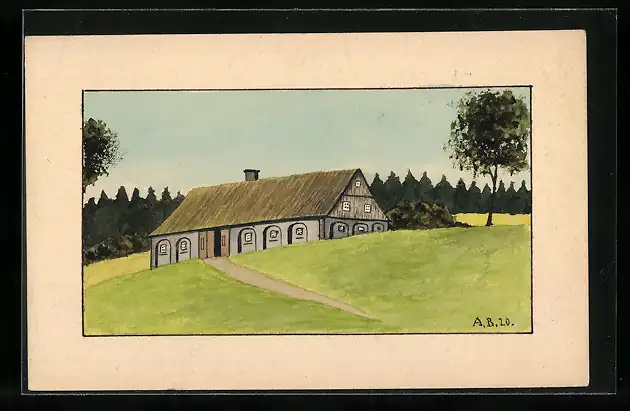 Künstler-AK Handgemalt: Scheune am Waldrand