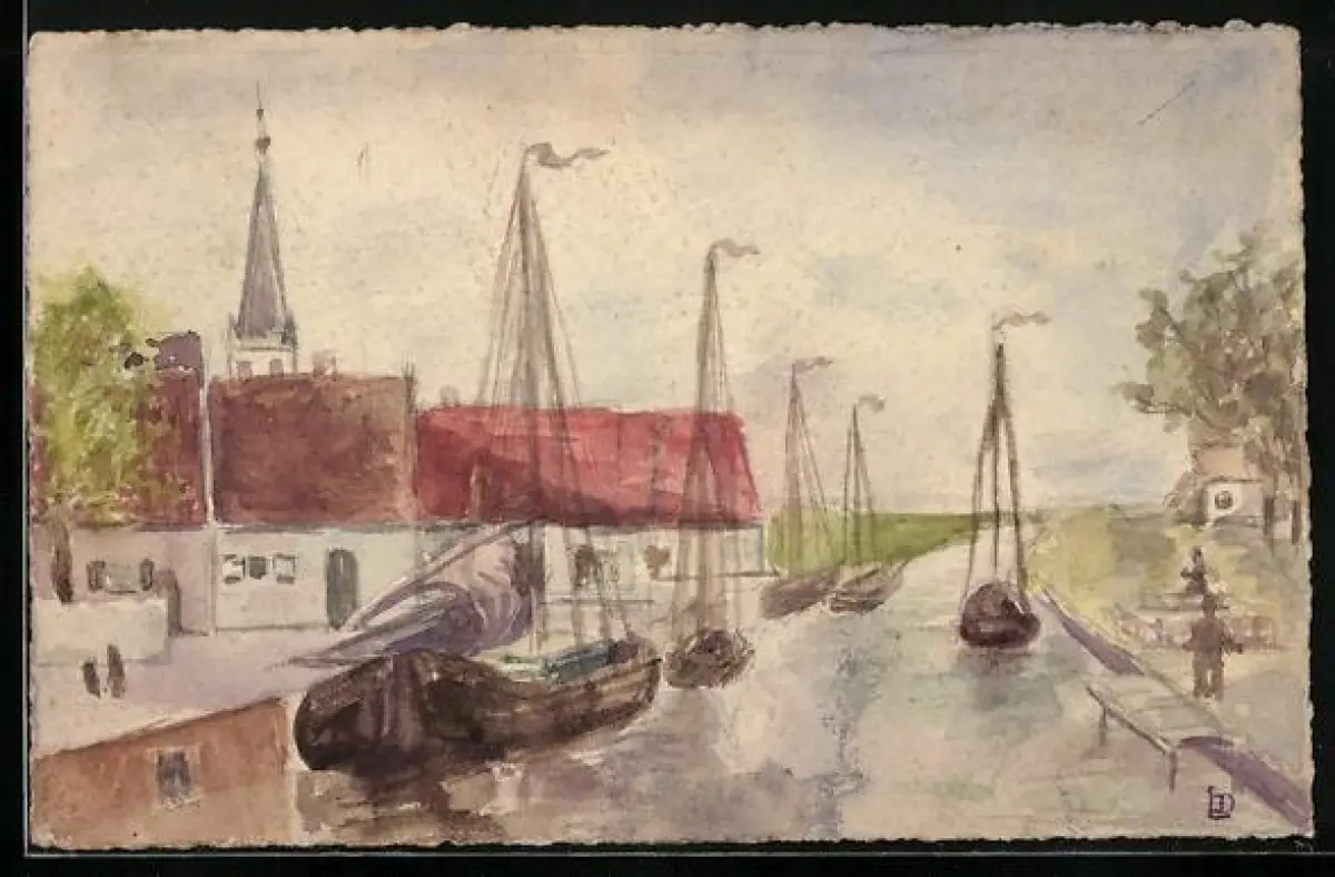 Künstler-AK Handgemalt: Segelboote auf einem Kanal