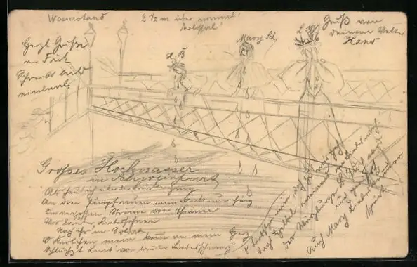 Künstler-AK Handgemalt: Weinende Frauen auf einer Brücke