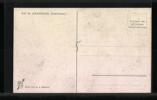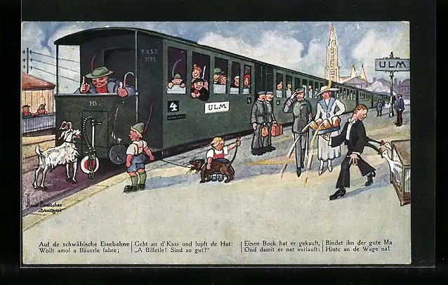 Künstler-AK Hans Boettcher: Ulm, Schwäb. Eisenbahn, Auf de schwäbische Eisebahne wollt amol a Bäuerle fahre..., Humor