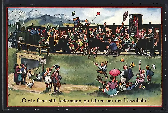 Künstler-AK Hans Boettcher: vollüberladende Eisenbahn mit vielen Menschen