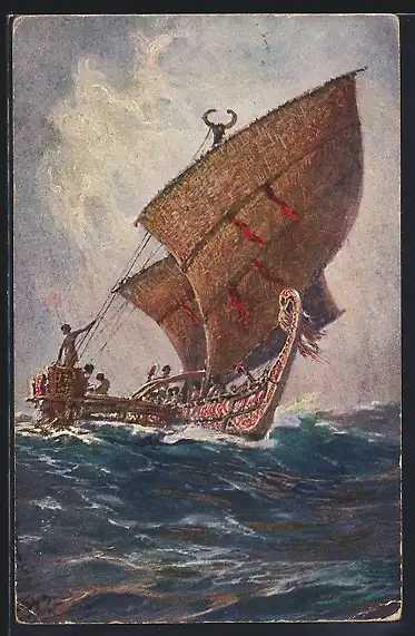 Künstler-AK Hans Bohrdt: Letztes Boot von der Insel Ugomes /Südsee auf bewegter See