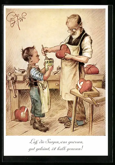 Künstler-AK Heinz Geilfus: Lass die Sorgen, was gewesen, gut geleimt, ist halb genesen!