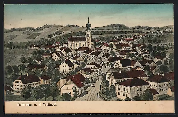 Künstler-AK Hofkirchen a. d. Trattnach, Teilansicht mit Kirche und Strassenpartie
