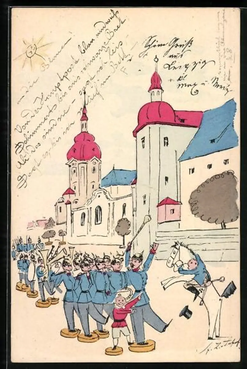Künstler-AK Holzfiguren-Orchester wird von kleinem Jungen durch die Strassen geführt