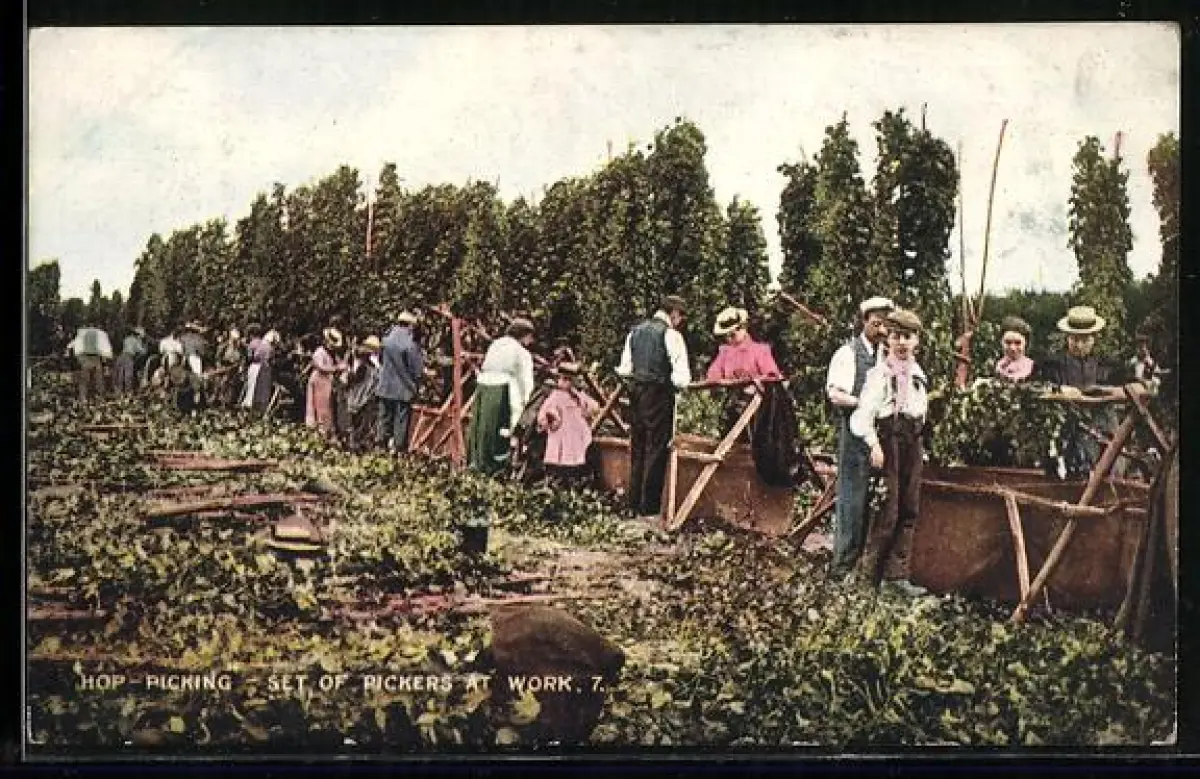 Künstler-AK Hop Picking, Set of Pickers at work, Bauern ernten Hopfen