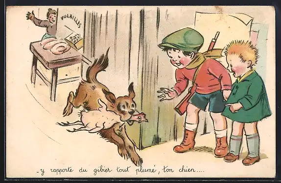Künstler-AK Hund rennt mit gerupftem Huhn davon