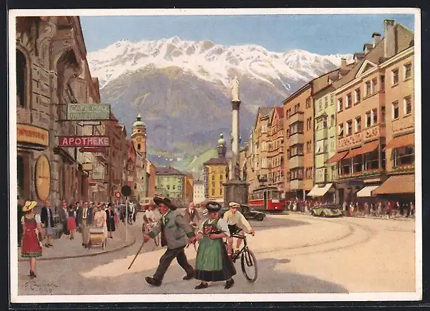 Künstler-AK Innsbruck, Strassenbahn in der Maria-Theresia-Strasse