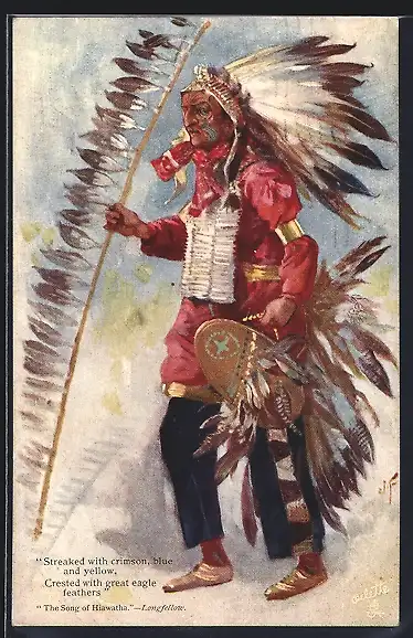 Künstler-AK J. F.: The Song of Hiawatha - Longfellow, Tänzer mit Federschmuck, First Nation