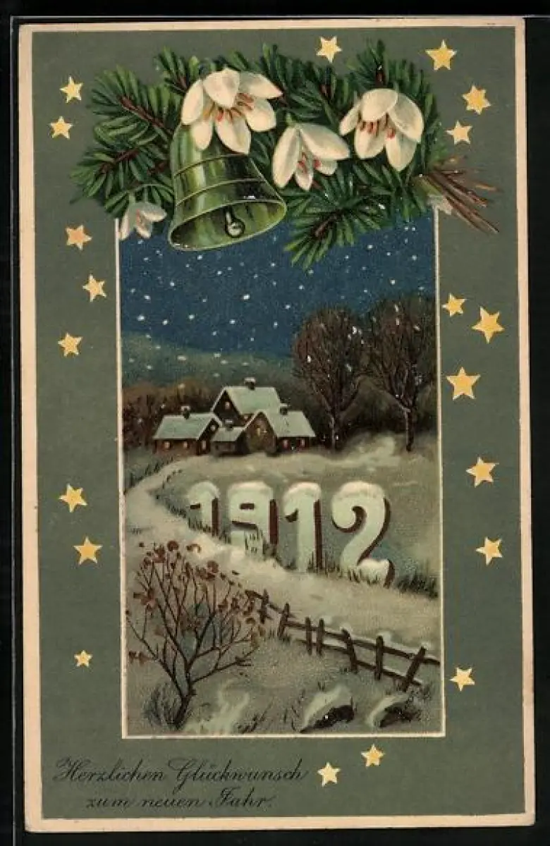 Künstler-AK Jahreszahl 1912 im Schnee vor einem Ort
