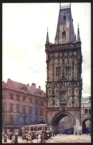 Künstler-AK Jaroslav Setelik: Prag, Pulverturm mit Strassenbahn